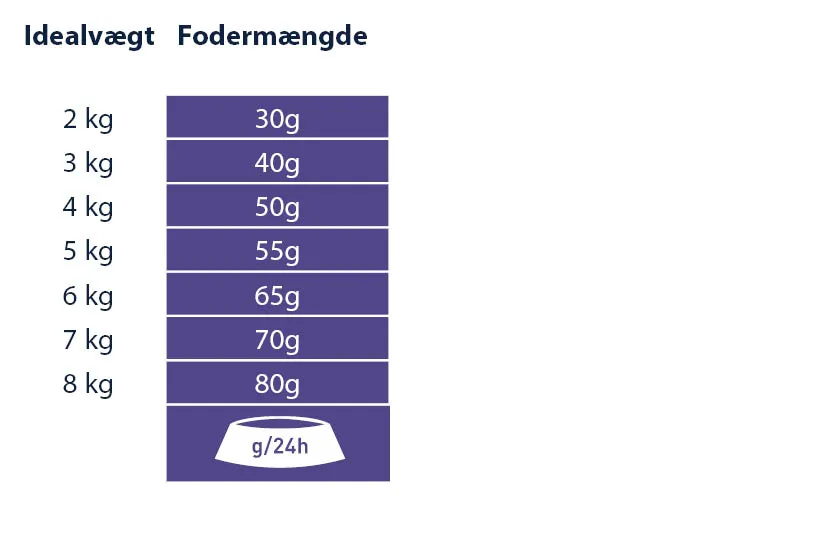 Sørg for, at der er frisk drikkevand til rådighed på alle tidspunkter, i en god afstand fra foderskålen. I betragtning af forskellen mellem de enkelte katte, kan den angivne daglige mængde reduceres med op til 15 %. Opdel den daglige mængde af foder, i flere måltider.