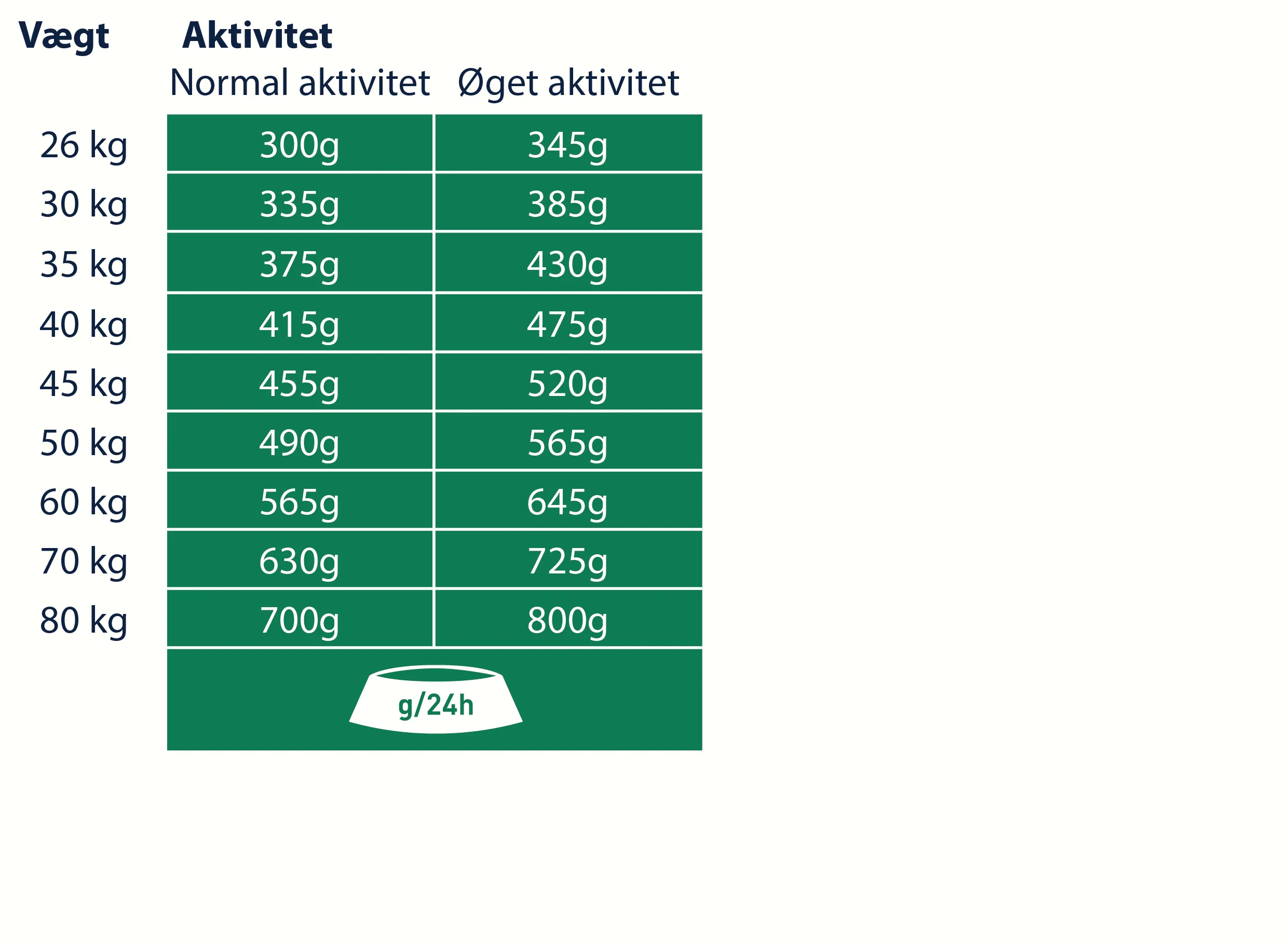 Giv foderet tør eller tilføj frisk, varmt vand (ved omkring 50-60° C) og lad det trække i et par minutter. Sørg for, at der er frisk drikkevand til rådighed på alle tidspunkter. Reducer mængden af foder, hvis du også giver din hund snacks/godbidder. I betragtning af forskellen mellem de enkelte hunde, kan den angivne daglige mængde reduceres med op til 15 %, hvis hunden har tendens til at være overvægtig.