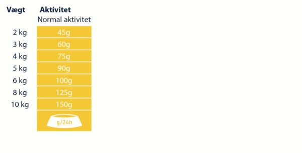 Giv foderet tør eller tilføj frisk, varmt vand (ved omkring 50-60° C) og lad det trække i et par minutter. Sørg for, at der er frisk drikkevand til rådighed på alle tidspunkter. Reducer mængden af foder, hvis du også giver din hund snacks/godbidder. I betragtning af forskellen mellem de enkelte hunde, kan den angivne daglige mængde reduceres med op til 15 %, hvis hunden har tendens til at være overvægtig.