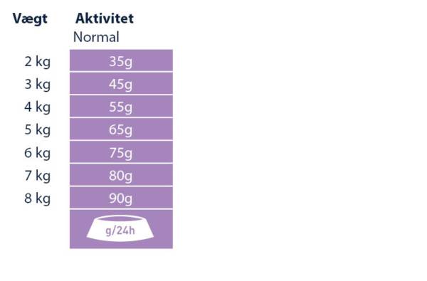 Sørg for, at der er frisk drikkevand til rådighed på alle tidspunkter, i en god afstand fra foderskålen. I betragtning af forskellen mellem de enkelte katte, kan den angivne daglige mængde reduceres med op til 15 %. Opdel den daglige mængde af foder, i flere måltider.