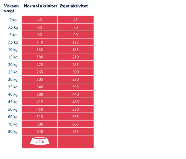Råprotein 24,0%, råfedt 18,0%, råfibre 2,0%, råaske 5,5%, calcium 1,2%, fosfor 0,8%, natrium 0,25%, kalium 0,6%, magnesium 0,1%, omega-6-fedtsyrer 3,0%, omega-3-fedtsyrer 0,3%.