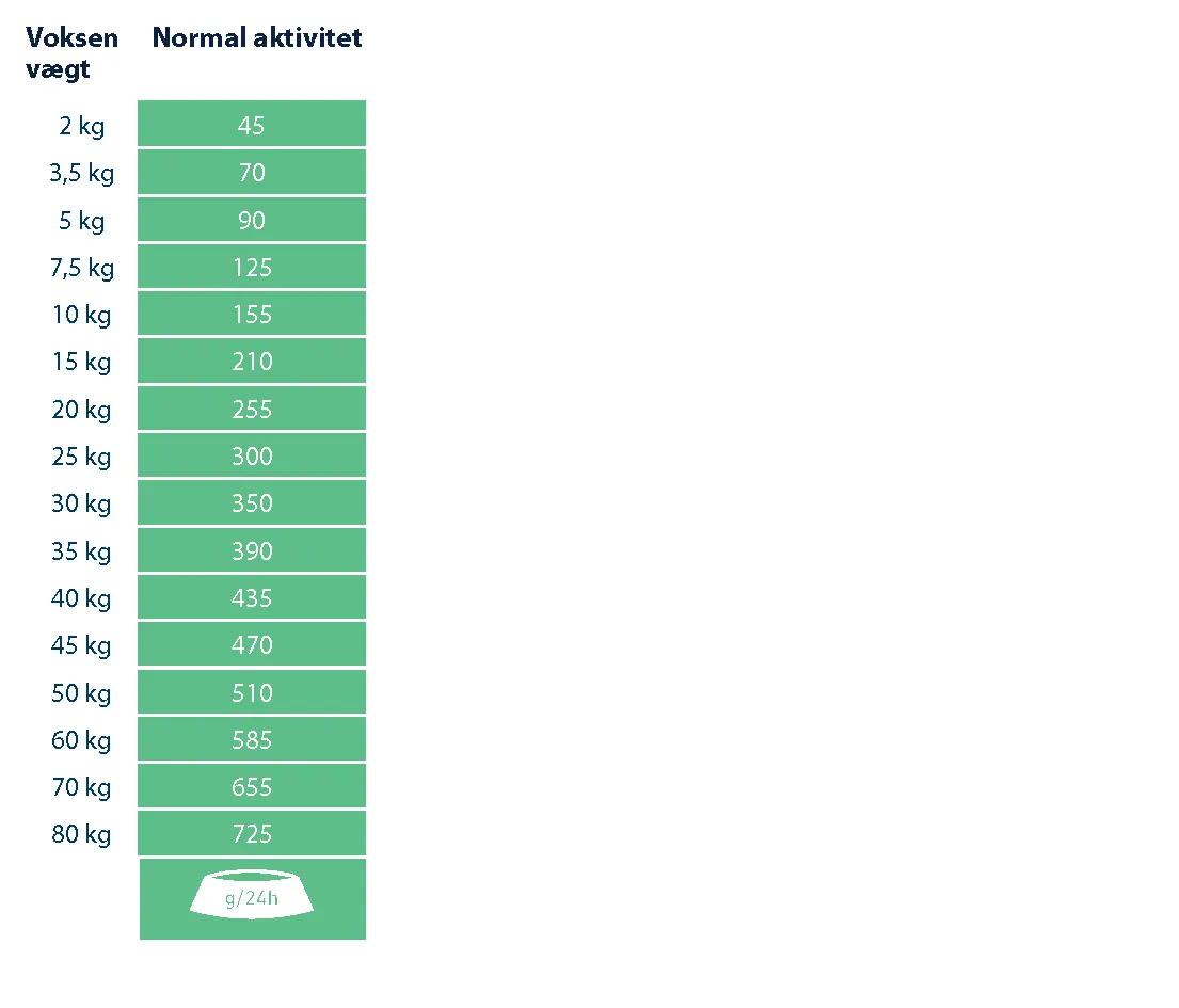 Giv foderet tør eller tilføj frisk, varmt vand (ved omkring 50-60° C) og lad det trække i et par minutter. Sørg for, at der er frisk drikkevand til rådighed på alle tidspunkter. Reducer mængden af foder, hvis du også giver din hund snacks/godbidder. I betragtning af forskellen mellem de enkelte hunde, kan den angivne daglige mængde reduceres med op til 15 %, hvis hunden har tendens til at være overvægtig.