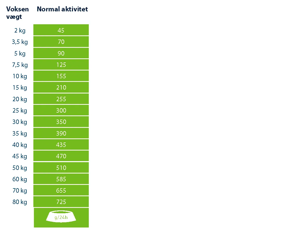 Råprotein 22,0%, råfedt 9,0%, råfiber 3,0%, råaske 6,5%, calcium 1,5%, fosfor 1,0%, natrium 0,25%, kalium 0,6%, magnesium 0,12%, omega-6 fedtsyrer 2,2%, omega-3 fedtsyrer 0,2%.