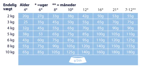 Oplysningerne er vejledende. Behovene varierer afhængigt af alder, race, holdning og aktivitet. En justering af fodermængden kan derfor være nødvendig på individuel basis.