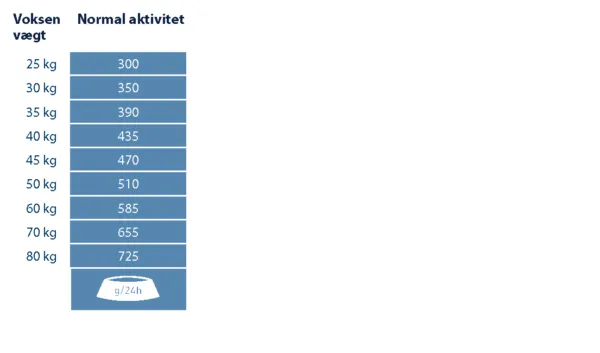Giv foderet tør eller tilføj frisk, varmt vand (ved omkring 50-60° C) og lad det trække i et par minutter. Sørg for, at der er frisk drikkevand til rådighed på alle tidspunkter. Reducer mængden af foder, hvis du også giver din hund snacks/godbidder. I betragtning af forskellen mellem de enkelte hunde, kan den angivne daglige mængde reduceres med op til 15 %, hvis hunden har tendens til at være overvægtig.