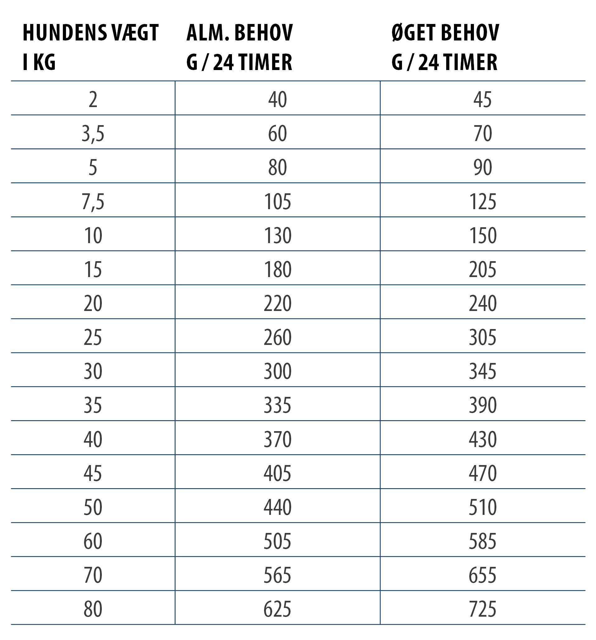 Giv foderet tør eller tilføj frisk, varmt vand (ved omkring 50-60° C) og lad det trække i et par minutter. Sørg for, at der er frisk drikkevand til rådighed på alle tidspunkter. Reducer mængden af foder, hvis du også giver din hund snacks/godbidder. I betragtning af forskellen mellem de enkelte hunde, kan den angivne daglige mængde reduceres med op til 15 %, hvis hunden har tendens til at være overvægtig.
