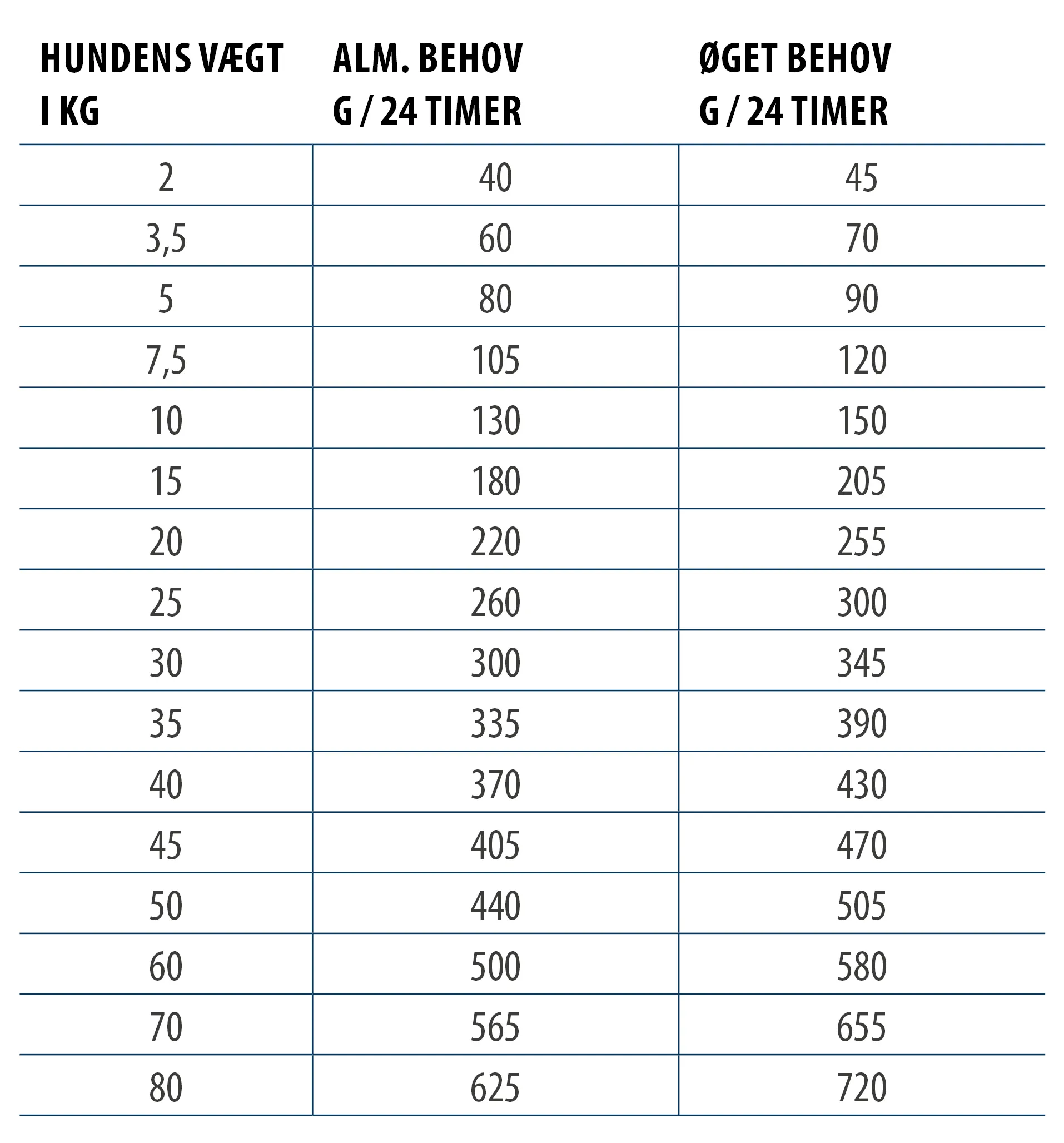 Giv foderet tør eller tilføj frisk, varmt vand (ved omkring 50-60° C) og lad det trække i et par minutter. Sørg for, at der er frisk drikkevand til rådighed på alle tidspunkter. Reducer mængden af foder, hvis du også giver din hund snacks/godbidder. I betragtning af forskellen mellem de enkelte hunde, kan den angivne daglige mængde reduceres med op til 15 %, hvis hunden har tendens til at være overvægtig.