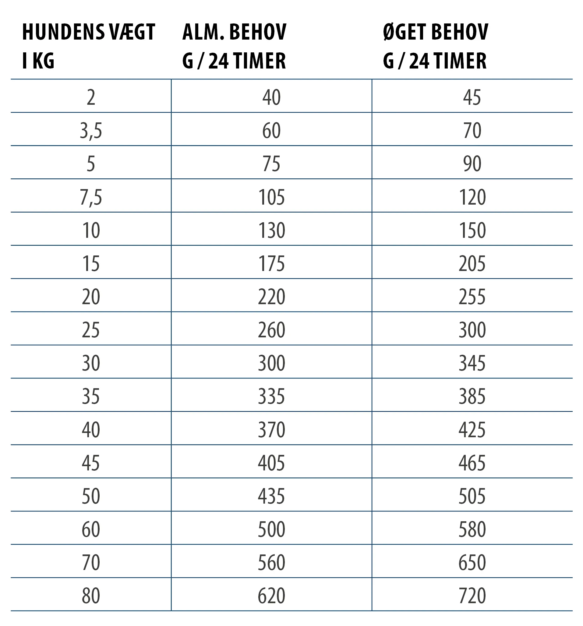 Giv foderet tør eller tilføj frisk, varmt vand (ved omkring 50-60° C) og lad det trække i et par minutter. Sørg for, at der er frisk drikkevand til rådighed på alle tidspunkter. Reducer mængden af foder, hvis du også giver din hund snacks/godbidder. I betragtning af forskellen mellem de enkelte hunde, kan den angivne daglige mængde reduceres med op til 15 %, hvis hunden har tendens til at være overvægtig.