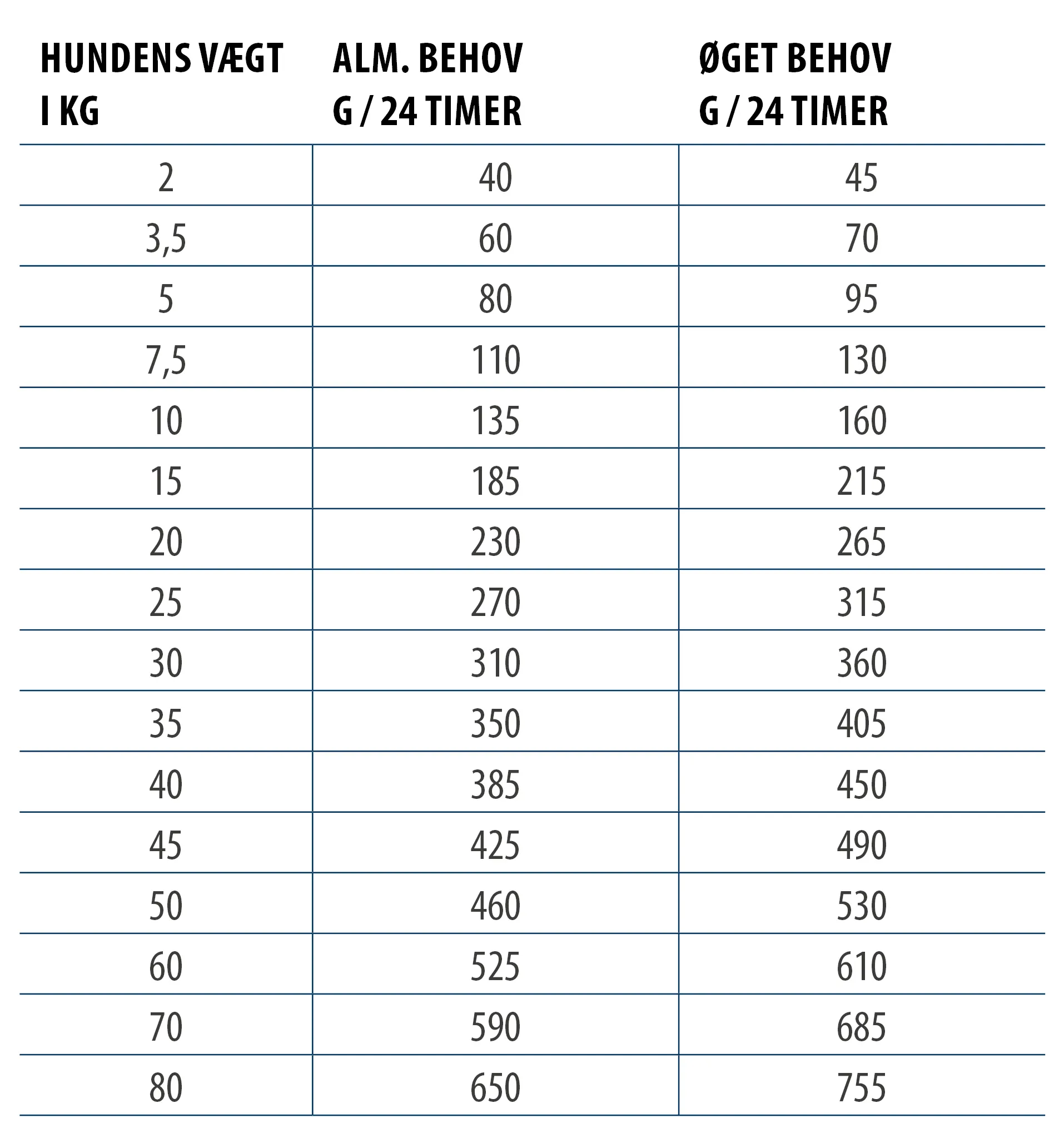 Giv foderet tør eller tilføj frisk, varmt vand (ved omkring 50-60° C) og lad det trække i et par minutter. Sørg for, at der er frisk drikkevand til rådighed på alle tidspunkter. Reducer mængden af foder, hvis du også giver din hund snacks/godbidder. I betragtning af forskellen mellem de enkelte hunde, kan den angivne daglige mængde reduceres med op til 15 %, hvis hunden har tendens til at være overvægtig.
