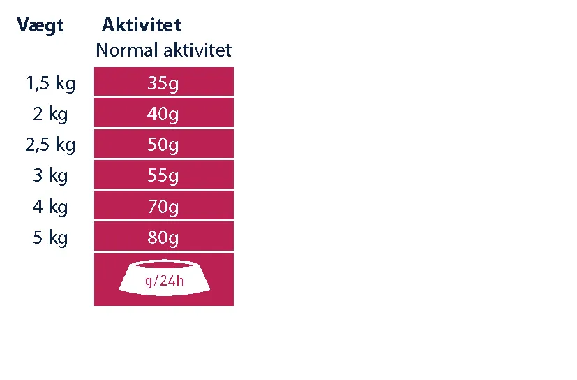 Giv foderet tør eller tilføj frisk, varmt vand (ved omkring 50-60° C) og lad det trække i et par minutter. Sørg for, at der er frisk drikkevand til rådighed på alle tidspunkter. Reducer mængden af foder, hvis du også giver din hund snacks/godbidder. I betragtning af de metaboliske forskelle mellem de enkelte hunde, kan den angivne daglige mængde reduceres med op til 15 %, hvis hunden har tendens til at være overvægtig.