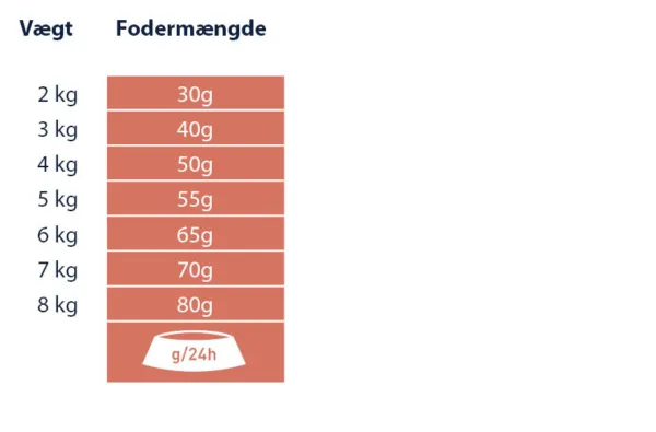 Sørg for, at der er frisk drikkevand til rådighed på alle tidspunkter, i en god afstand fra foderskålen. I betragtning af forskellen mellem de enkelte katte, kan den angivne daglige mængde reduceres med op til 15 %. Opdel den daglige mængde af foder, i flere måltider.