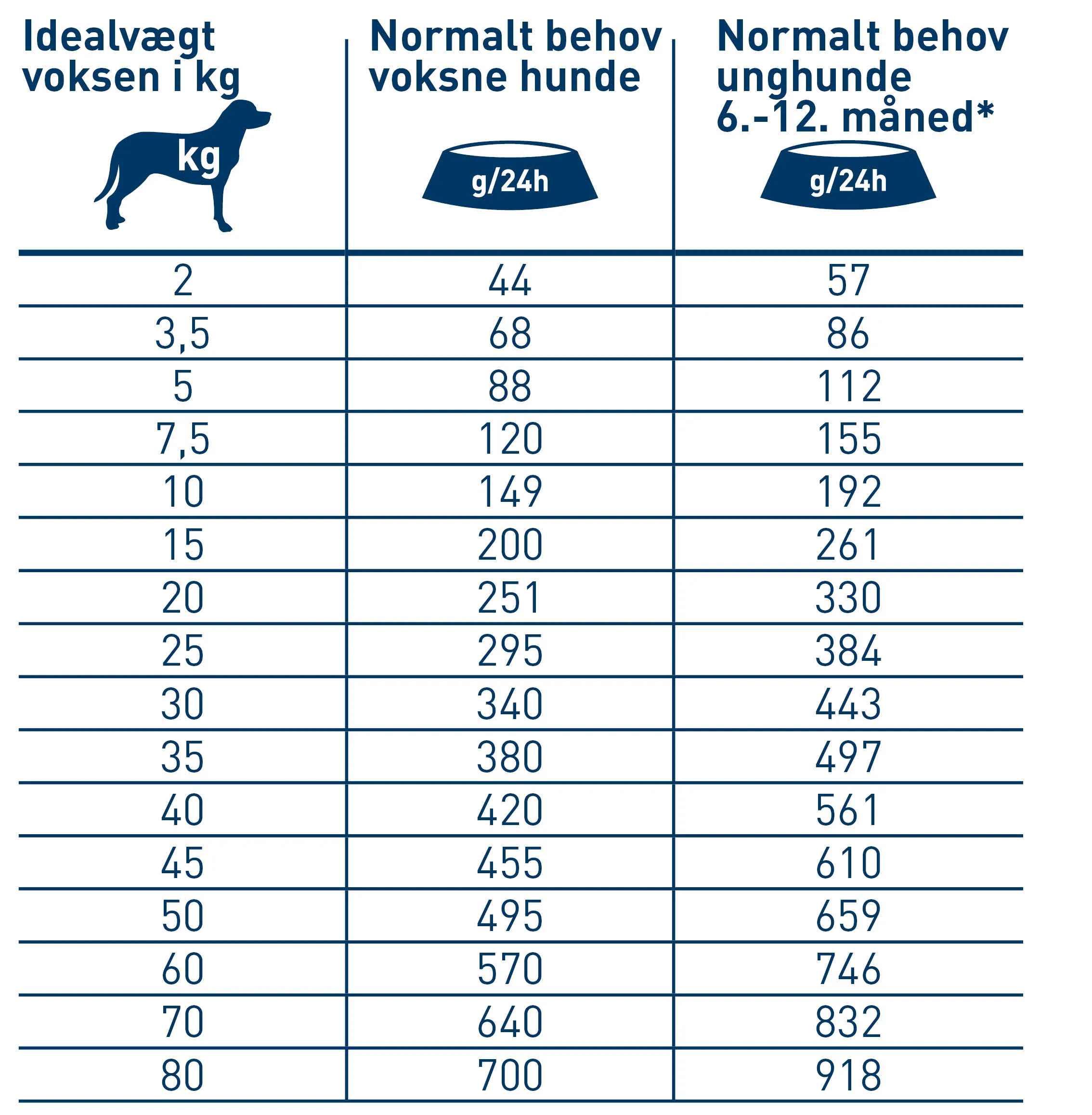 * senest mellem 12-15. levemåned skal mængden af foder langsomt reduceres til den anbefalede daglige mængde til “normale voksne hundes behov” i overensstemmelse med det faldende energibehov. Bemærk ved blandet fodring: 100 g vådfoder ≈ 40 g tørfoder.