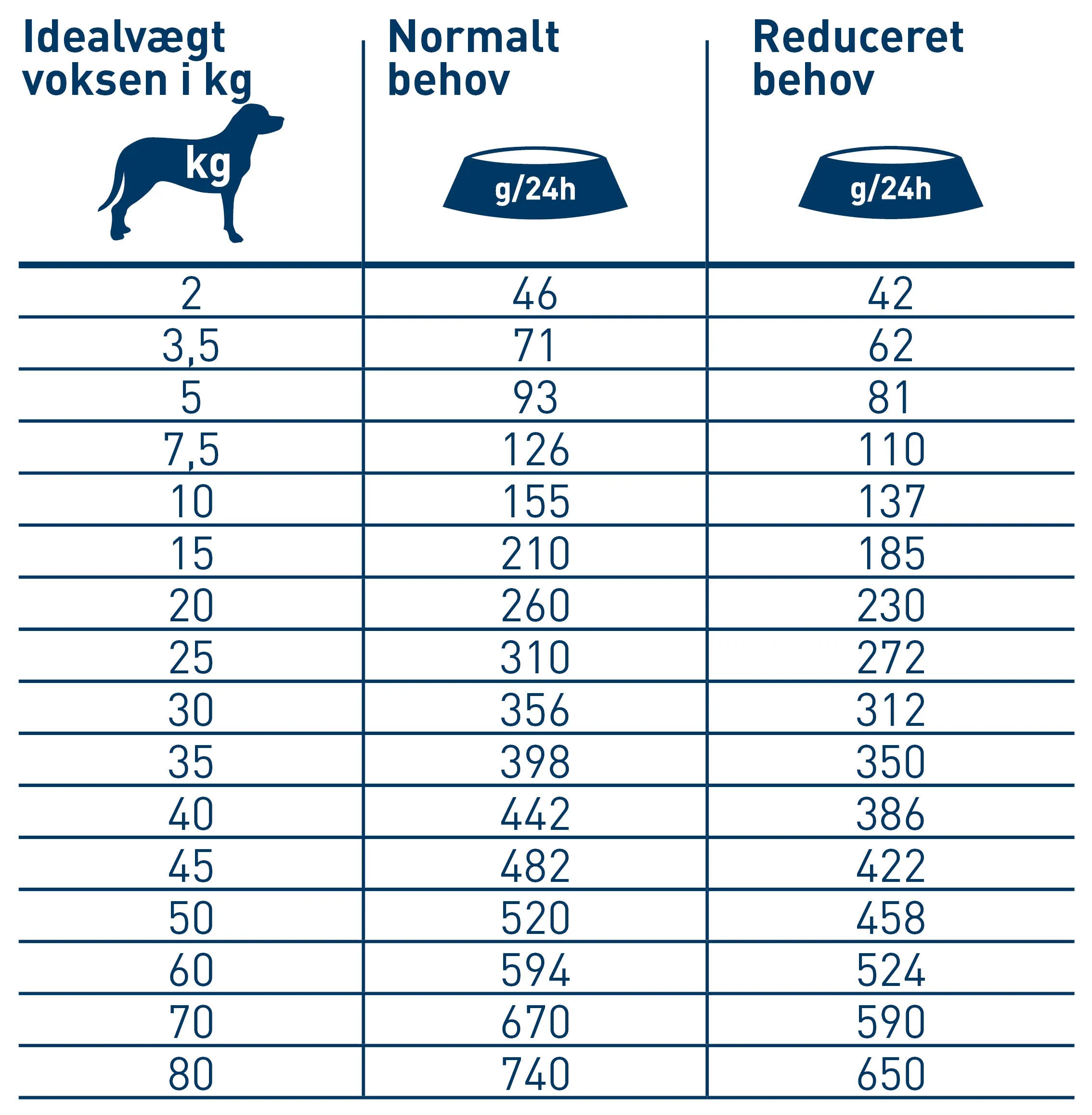 Mængden af foder skal tilpasses hundens individuelle stofskifte og skal muligvis justeres i moderate mængder. Hunden skal altid have frisk vand til rådighed. Bemærk ved blandet fodring: 100 g vådfoder ≈ 30 g tørfoder