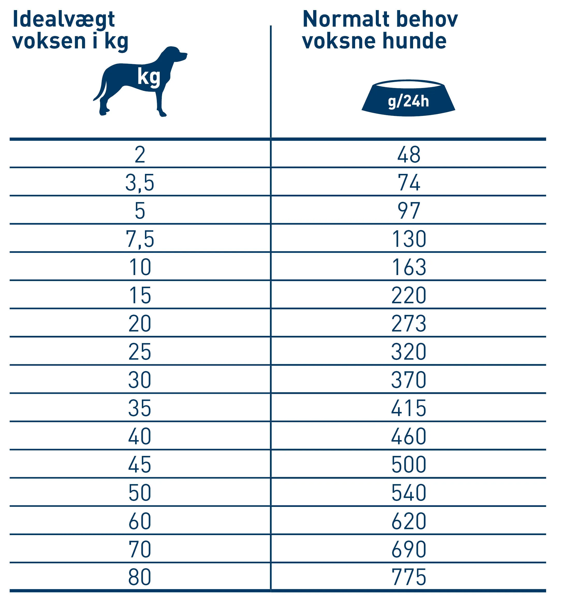 Mængden af foder skal tilpasses hundens individuelle stofskifte og skal muligvis justeres i moderate mængder. Hunden skal altid have frisk vand til rådighed.