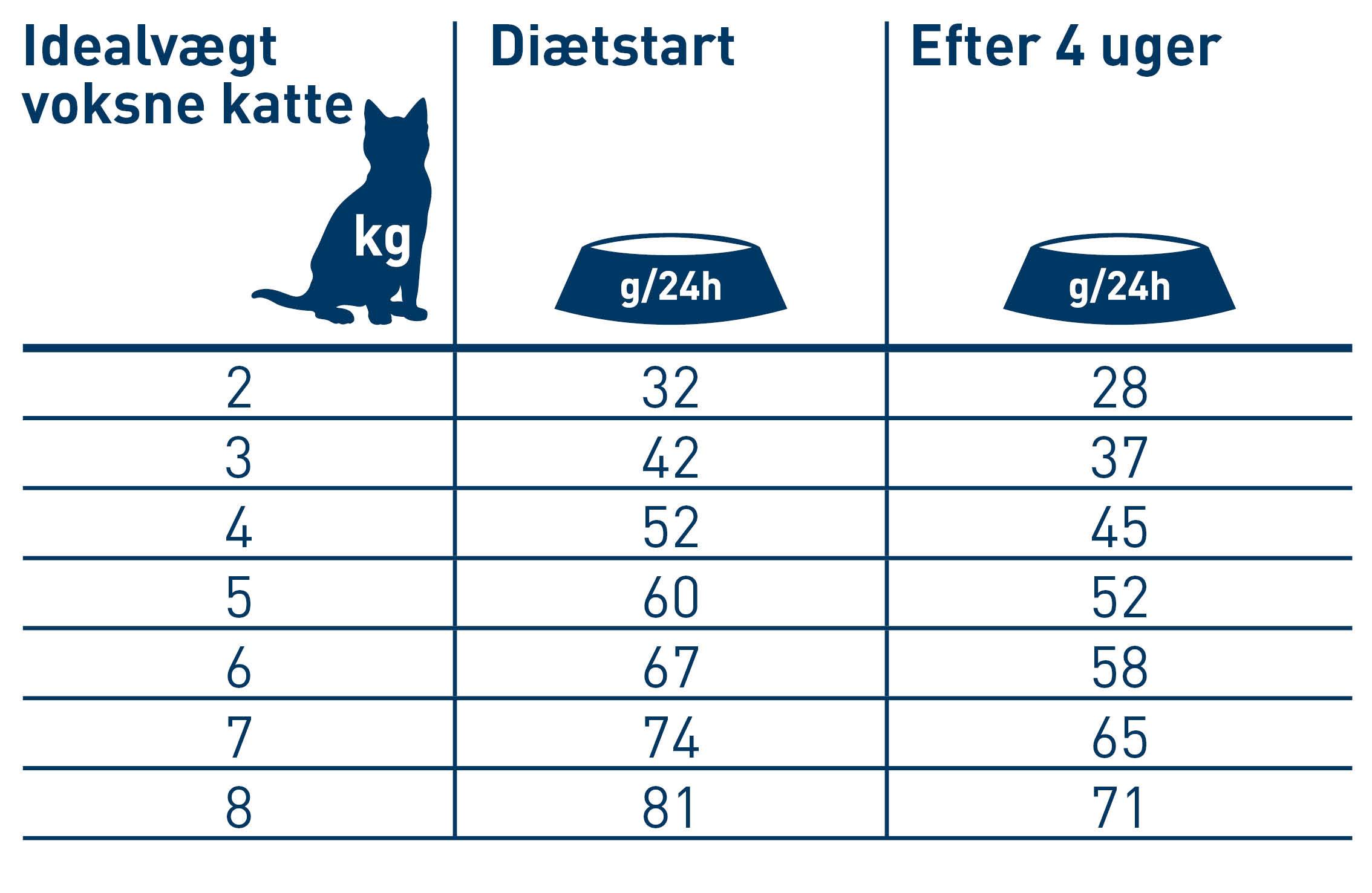 Den optimale vægtreduktion på 0,5 – 2% af den aktuelle kropsvægt pr. uge bør kontrolleres regelmæssigt. For at undgå fordøjelsesproblemer anbefales en langsom overgang til foderet over flere dage. Da katte er udsat for risikoen for feline hepatisk lipidose (fedtlever), bør hurtig vægttab og faste undgås. Øget afføring er forårsaget af det højere fiber indhold.