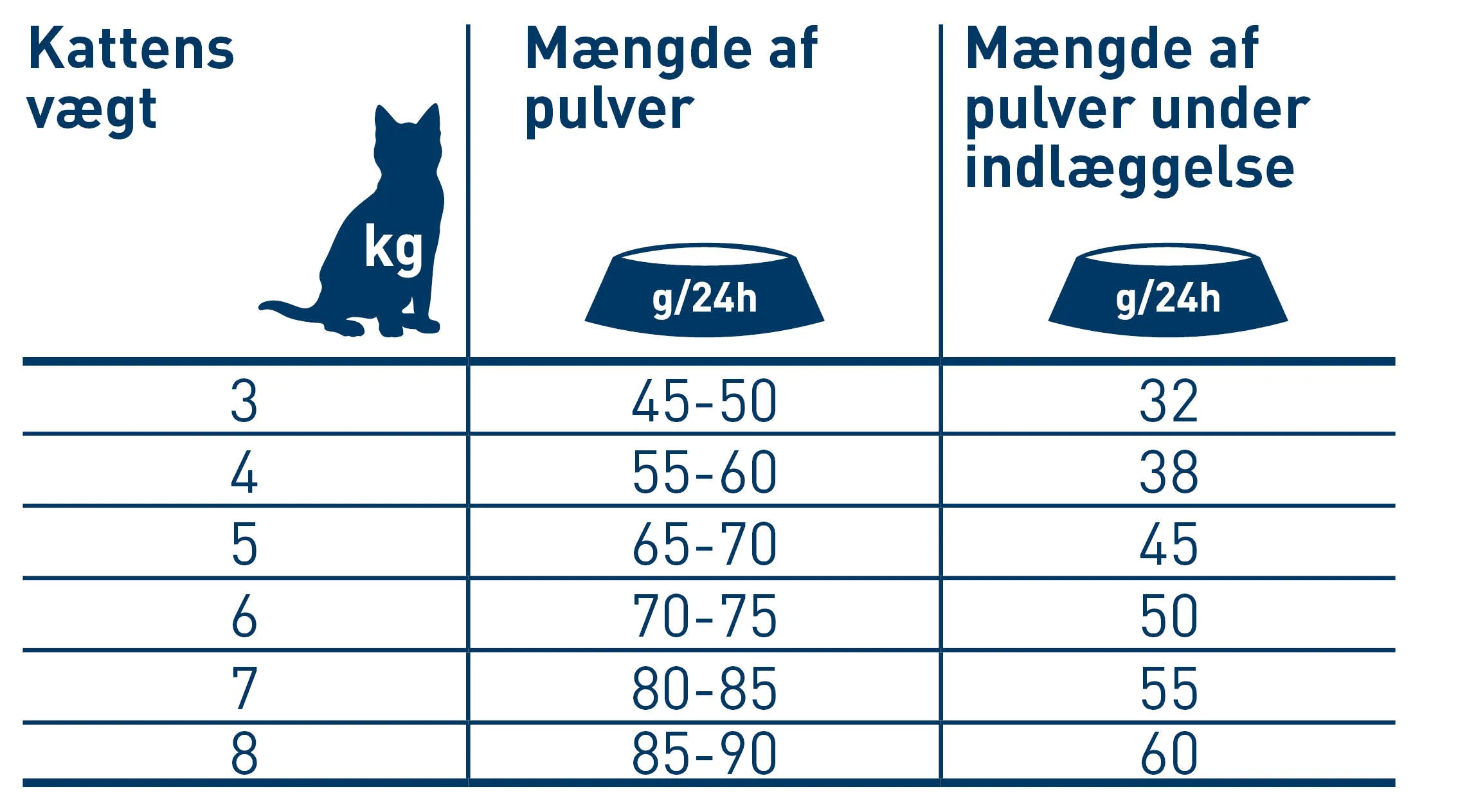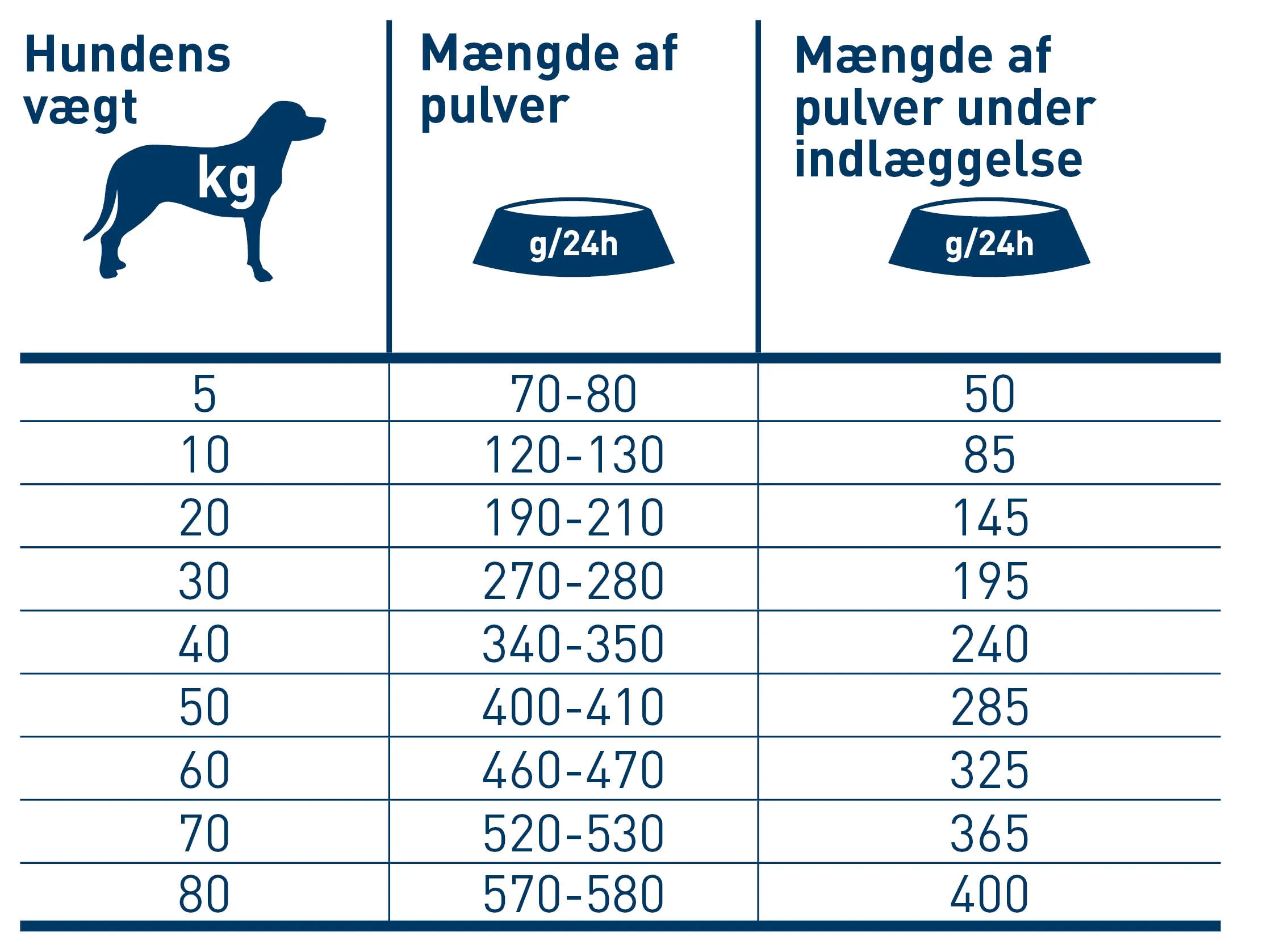 For indlagte dyr med reduceret energibehov anbefaler vi fodring med den stationære mængde af pulver.
